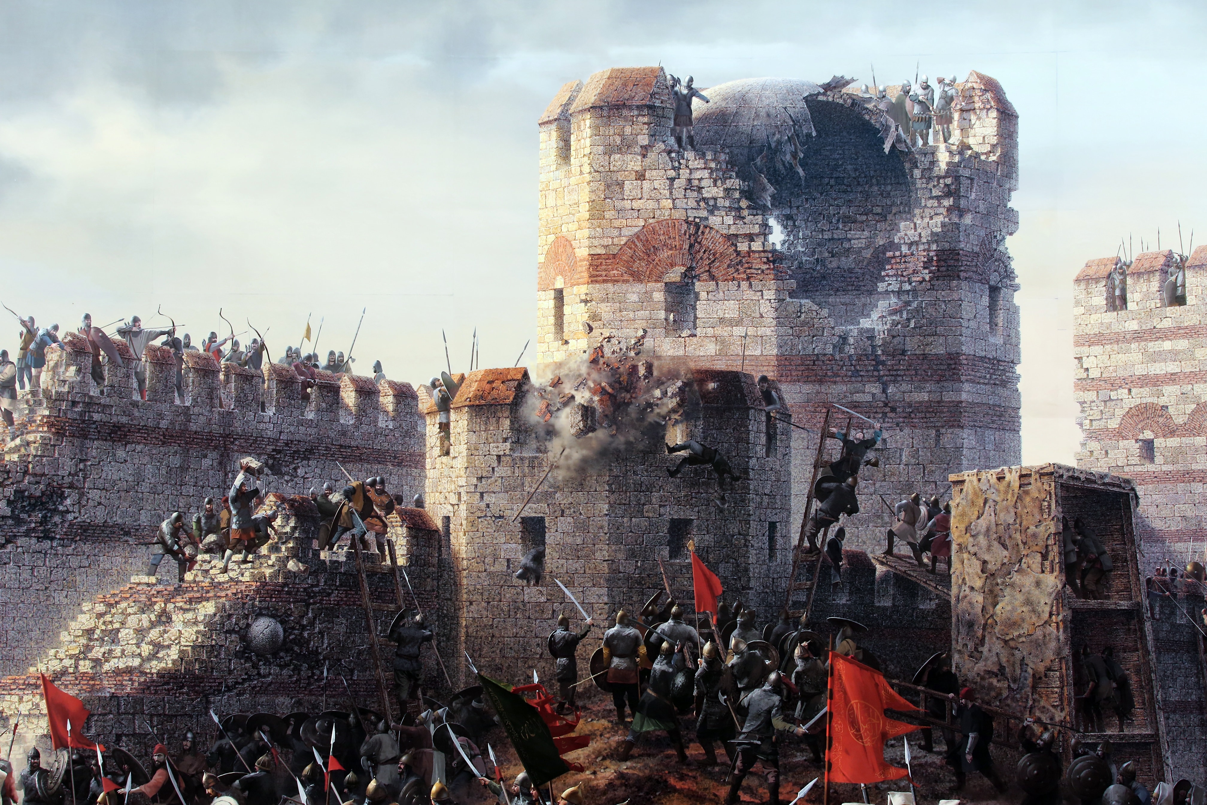 19 Mayıs sabahı Osmanlı ordusu, surlardan yüksek bir yürüyen kuleyi Adrianapolis Kapısı yakınlarına getirdi. Kat kat öküz/deve derisiyle kaplanmış ahşap bir iskeletten oluşuyordu ve iskeletin boşlukları toprakla doldurulmuştu, ok taş ve ufak güllelerin zarar veremediği bu kule sayesinde surdaki askerlere ok atılırken hendekler de toprakla dolduruldu. Aynı gün Osmanlı ordusu Haliç’in daraldığı yerde birbirine bağlanmış fıçılardan oluşan bir köprü inşa etti; Bizanslıların açabileceği bir ateşle yok edilmemesi için Haliç surlarındaki Kynegos Kapısı’na uzatılmadı. Bizans tarafı, yarım kalmış bu köprünün Kynegos Kapısı’na uzatılması ihtimaline karşın Haliç surlarına asker konuşlandırmak zorunda kaldı. 21 Mayıs’ta bütün Osmanlı donanması Haliç önlerine geldi, genel taarruzun başlayacağını zanneden şehir halkı paniğe kapıldı ve kiliselerde çanlar çalındı; fakat herhangi bir kara taarruzu olmadığı gibi Osmanlı donanması da birkaç saat sonra geri döndü. Kuşatma esnasında şehirde bulunan Venedikli doktor Barbaro’ya göre surlar aralıksız her gün bombalanmaktaydı; tarif ettiği bir top 544 kiloluk gülle atıyordu ve her atışı şehir içerisinde paniğe yol açıyordu.